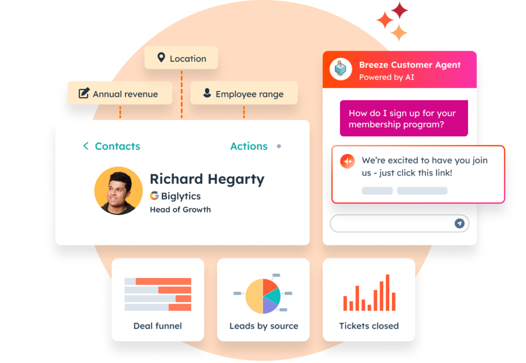 Use Breeze Copilot to assist with tasks, Breeze Agents to automate your work, Breeze Intelligence to enrich your data, and a growing list of Breeze features to help you get work done faster.